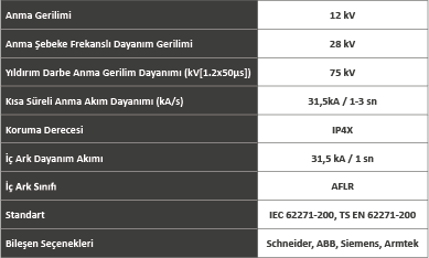 ARMC Serisi 12 kV Metal Clad hücre tipleri 5 ana bölümden oluşmaktadır. Bu bölümler metal perdelerle bölünmüş olup, devamlılık sağlanacak geçişlerde hareketli perde ve izolasyonlu geçiş ekipmanları kullanılmıştır.Tip testleri ICMET – LVT tarafından yapılmıştır.